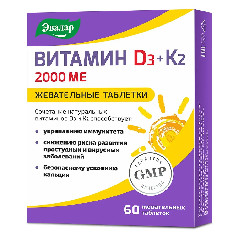 Биологически активная добавка Эвалар Витамин Д3 2000МЕ+К2 № 60 (жевательные таблетки)